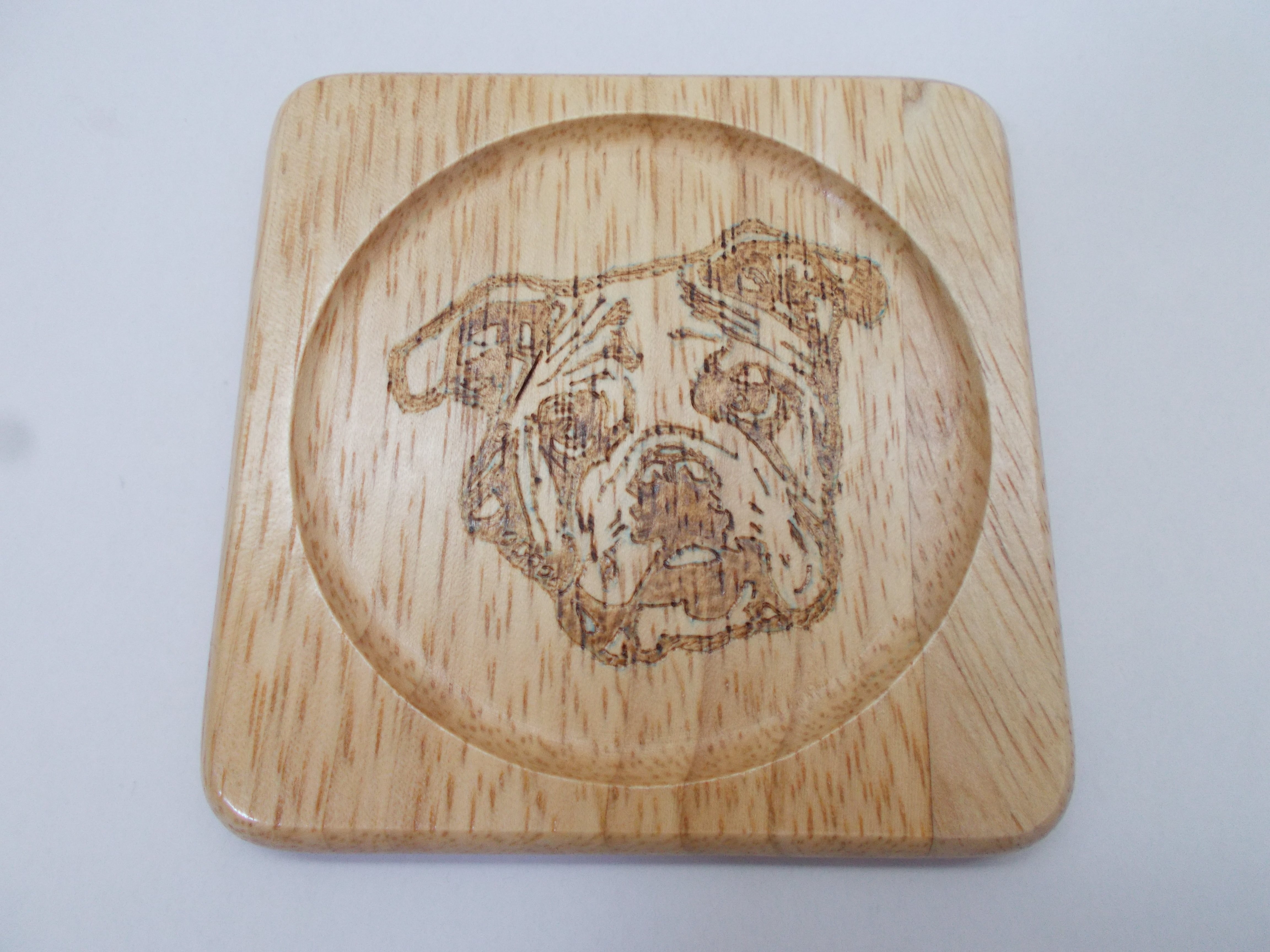 外形の直系約9cm、内側円直径約7.8cmの中に犬を描いた、木のコースターです。